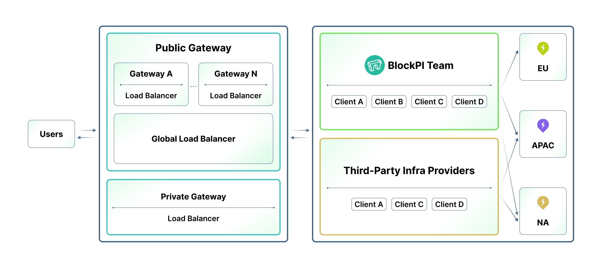 BlockPI Network aims to provide high-quality, robust, and efficient RPC service. To avoid the single-point failure and limitation of scalability, the network is designed to be a distributed structure with expandable working nodes. This page introduces the detailed roles and the service mechanisms of the BlockPI Network.